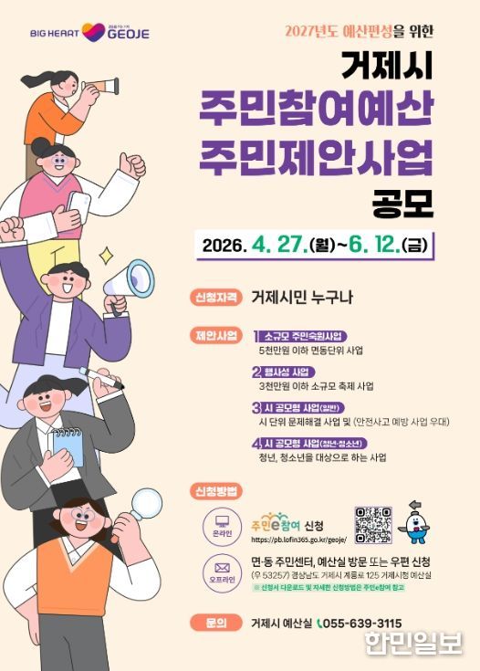 한민일보 서울포커스 김은금 기자 | 거제시는 2027년도 본예산 편성을 앞두고 재정운용의 투명성과 시민에게 공감받는 예산편성을 실현하고자 오는 6월 12일까지‘주민참여예산 제안사업 공모’를 실시한다.