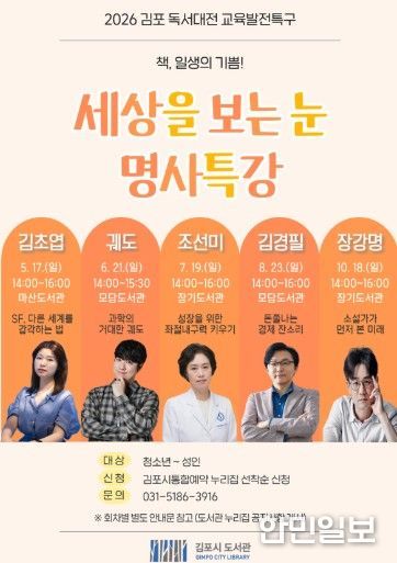 한민일보 서울포커스 임경복 기자 | 김포시 도서관은 2026 김포 독서대전 교육발전특구 사업으로 '세상을 보는 눈, 명사특강'을 오는 5월 17일부터 10월 18일까지 5회에 걸쳐 관내 도서관 3곳에서 진행한다.