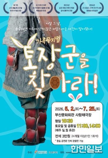 한민일보 서울포커스 임광현 기자 | (재)부산문화회관은 가족 뮤지컬 '토장군을 찾아라'를 오는 5월 2일부터 7월 25일까지 부산문화회관 사랑채극장에 올린다.