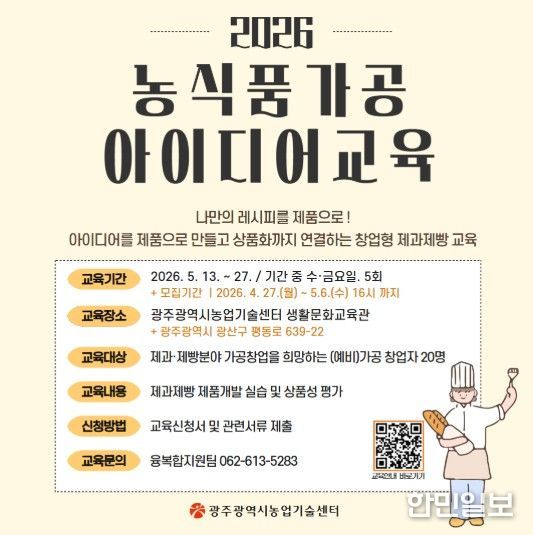 한민일보 서울포커스 임경복 기자 | 광주광역시 농업기술센터는 제과·제빵 창업을 희망하는 예비창업자를 대상으로 ‘농식품 가공 아이디어 교육’을 5월 13일부터 27일까지 총 5회 과정으로 운영한다.