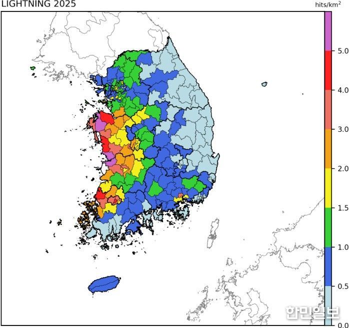 한민일보 서울포커스 진광성 기자 | 기상청은 2025년 우리나라에서 관측된 낙뢰 정보를 담은 ‘2025 낙뢰연보’를 발간했다. 연보는 기상청 21개 낙뢰 관측망으로 관측한 자료를 통해 분석한 △월별, 광역시·도별, 시군구별 낙뢰 횟수 △단위 면적당(㎢) 횟수 △낙뢰 공간 분포 △주요 5대 낙뢰 사례 등의 내용을 담고 있다.