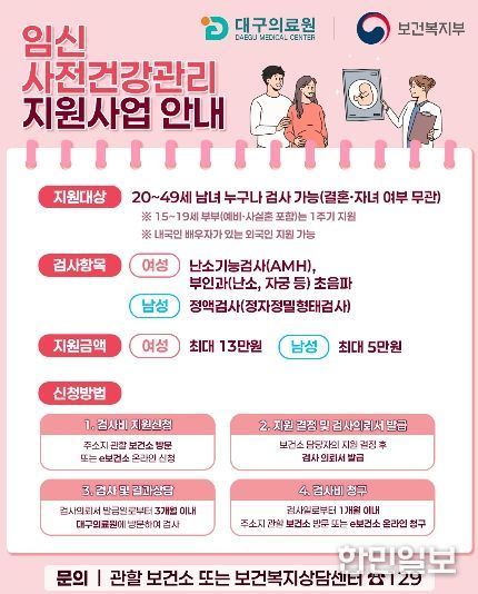 한민일보 서울포커스 임경복 기자 | 대구의료원 난임센터는 임신·출산에 장애가 될 수 있는 건강 위험요인을 조기에 발견하기 위한 ‘임신 사전건강관리 지원사업’ 참여의료기관으로 선정돼, 지역 주민의 건강한 임신·출산 환경 조성을 적극 지원한다.