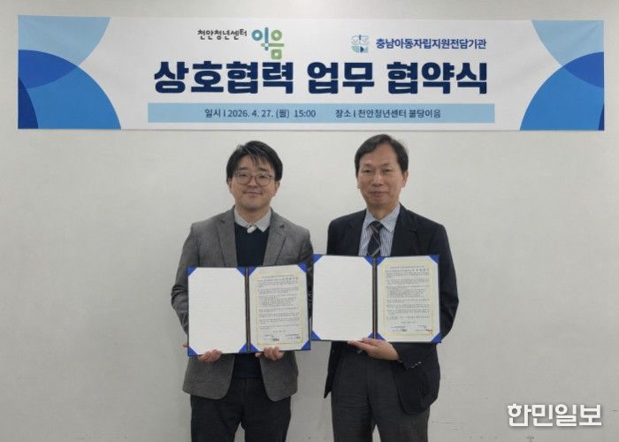 한민일보 서울포커스 황준형 기자 | 천안시는 천안청년센터 이음이 27일 충남아동자립지원전담기관과 ‘취약계층 청년 발굴 및 통합 지원을 위한 업무협약’을 체결했다고 밝혔다.