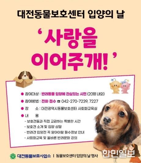 한민일보 서울포커스 김서윤 기자 | 대전동물보호사업소는 5월 16일 ‘사랑을 이어주개’를 주제로 시민과 보호동물이 함께하는 ‘유기동물 입양의 날’ 행사를 개최한다.