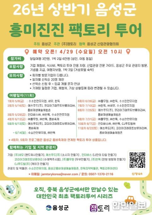 팩토리투어 예약은 4월 29일 오전 10시부터 가능하며 상세한 정보와 예약 방법은 음성군 SNS와 음성군청 문화관광 누리집을 참고하면 된다.