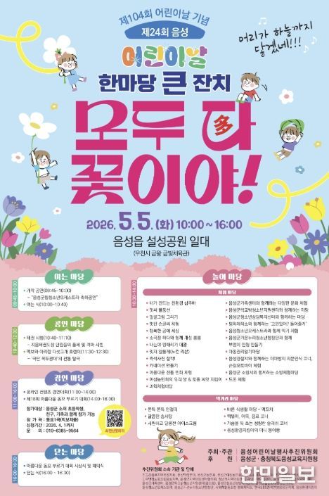 한민일보 서울포커스 김다남 기자 | 제104회 어린이날을 맞아 ‘제24회 음성 어린이날 한마당 큰 잔치’가 오는 5월 5일 오전 10시부터 오후 4시까지 음성읍 설성공원 일원에서 열린다.