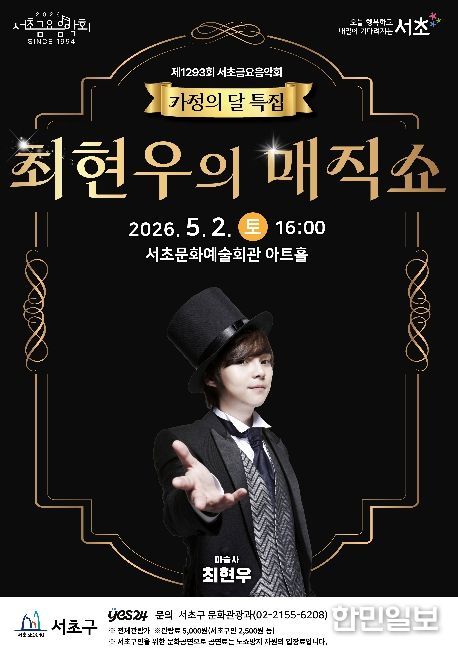 한민일보 서울포커스 곽중희 기자 | 서울 서초구가 가정의 달 5월을 맞아 오는 5월 2일 토요일 오후 4시, 서초문화예술회관 아트홀에서 서초토요콘서트 '최현우의 매직쇼'를 개최한다고 밝혔다.