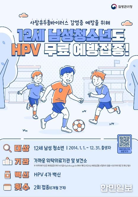 이번 사업은 오는 5월 6일부터 시행된다. 지원 대상은 2026년 기준 2014년생 남아(12세)로, HPV 백신(HPV4가)을 6개월 간격으로 총 2회 무료 접종받을 수 있다.