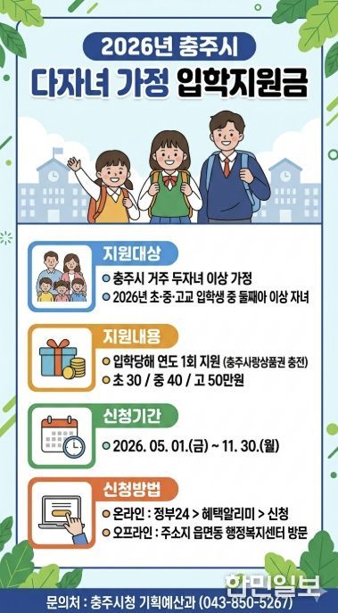한민일보 서울포커스 김다남 기자 | 충주시는 다자녀 가정의 경제적 부담을 완화하고 안정적인 양육 환경을 조성하기 위해 2026학년도 초·중·고등학교에 입학하는 둘째 자녀 이상에게 입학지원금을 지원한다고 밝혔다.