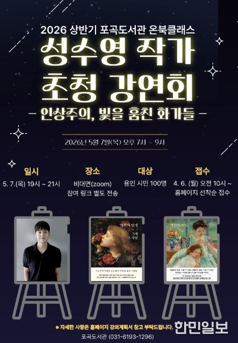 7일에는 ‘명화의 탄생, 그때 그 사람’의 저자 성수영 작가를 초청한 비대면 강연을 개최한다. 성 작가는 ‘인상주의, 빛을 훔친 화가들’을 주제로 명화에 담긴 역사와 이야기를 전달한다. 강연은 줌(ZOOM)으로 진행한다.