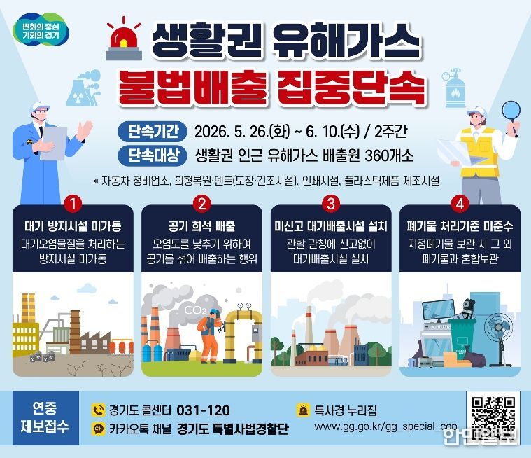 한민일보 서울포커스 김윤이 기자 | 경기도 특별사법경찰단이 5월 26일부터 6월 10일까지 2주간 주거지·학교·병원 등 생활권 인근 지역의 유해가스 배출 사업장을 대상으로 불법행위를 집중단속 한다.
