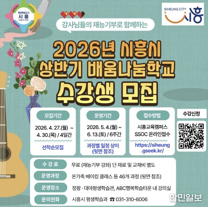 한민일보 서울포커스 유현민 기자 | 시흥시는 시민이 직접 강사가 되어 재능을 나누는 열린 평생학습 사업 ‘2026년 상반기 시흥시 배움나눔학교’에 참여할 수강생을 모집한다.