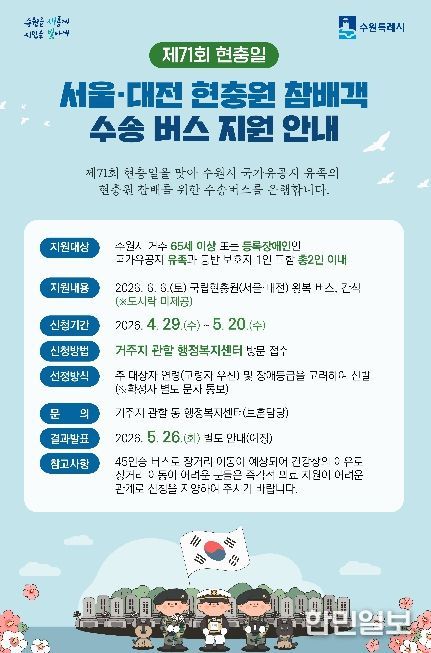 한민일보 서울포커스 진광성 기자 | 수원특례시가 제71회 현충일인 6월 6일, 국립현충원(서울·대전)까지 이동이 여의치 않은 국가유공자 유족을 위해 현충원 왕복 수송버스를 운행한다.