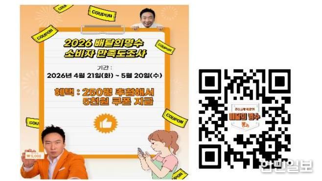 군산시는 오는 5월 20일까지 ‘배달의명수’ 이용 소비자와 가맹점을 대상으로 서비스 이용 만족도 및 개선사항 파악을 위한 설문조사를 진행하고 있다고 밝혔다.