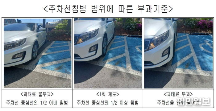 시에 따르면, 차량이 주차선 중심선을 기준으로 절반 이하만 침범한 경우에는 일부가 선에 걸쳐 있더라도 과태료를 부과하지 않는다. 그러나, 중심선을 기준으로 절반 이상 넘어간 경우에는 주차선 침범으로 간주하며, 최초 1회에 한해 계도 조치가 이루어진다. 다만, 차량이 주차구획선을 명확히 넘어 장애인전용주차구역 안으로 일부라도 침범한 경우에는 관련 법령에 따라 10만 원의 과태료를 부과한다.