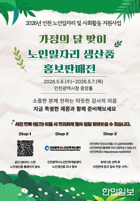 한민일보 서울포커스 유창렬 기자 | 인천시가 2026년 노인일자리 사업을 대폭 확대하고, 5월 가정의 달을 맞아 어르신들이 직접 제작한 생산품을 시민들에게 선보이는 홍보·판매 행사를 개최한다.