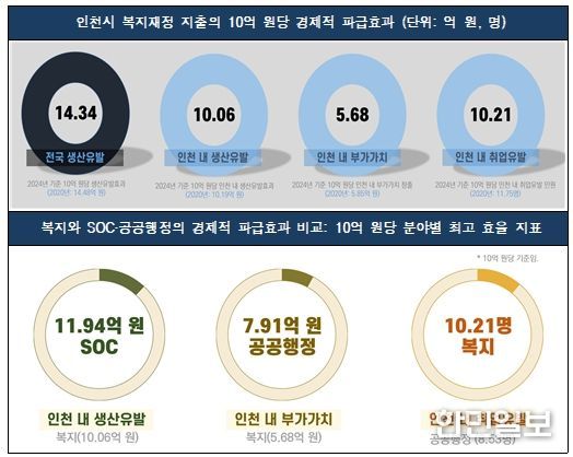 분석결과에 따르면, 2024년 기준 인천시 복지재정은 약 8.2조 원의 생산유발효과, 4.3조 원의 부가가치, 7만 1천 명의 취업유발효과를 창출한 것으로 나타났다.