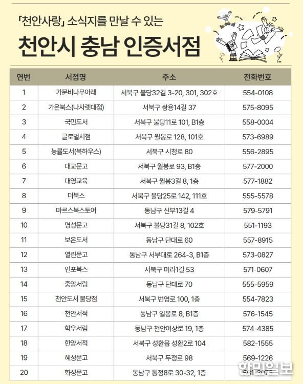 천안사랑이 비치된 서점 목록은 천안시 도서관 누리집에서 확인할 수 있다. 소식지는 카카오톡 채널 ‘천사통’과 모바일 앱으로 제공되며, 시청 누리집에서 우편 무료 구독 신청도 가능하다.