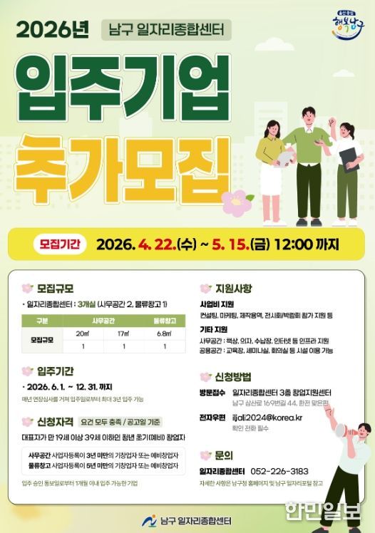 한민일보 서울포커스 기자 | 울산 남구는 청년들에게 창업공간을 지원해 안정적으로 사업을 수행할 수 있도록 남구 일자리 종합센터 사무공간 및 물류창고에 입주할 기업을 추가 모집하고 있다고 28일 밝혔다.