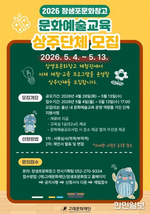 한민일보 서울포커스 기자 | (재)고래문화재단이 운영하는 장생포문화창고는 어린이와 시민들에게 예술 체험을 선물할 ‘문화예술교육 상주단체’를 모집한다고 28일 밝혔다.