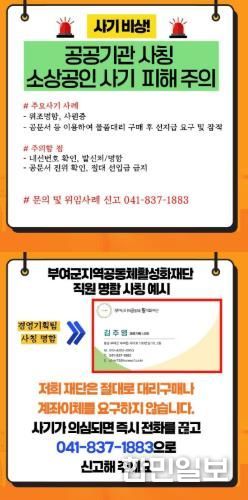 한민일보 서울포커스 유돈상 기자 | 부여군 지역공동체활성화재단은 최근 재단 직원을 사칭하여 물품 구매를 요청하는 의심 사례가 확인됨에 따라, 지역 소상공인과 협력업체를 대상으로 피해 예방 안내에 나섰다고 밝혔다.
