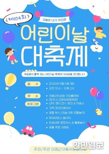 한민일보 서울포커스 김은금 기자 | 의령군은 다음달 5일 제104회 어린이날을 맞아 의령군민공원 기오름마당에서 ‘제104회 의령군 어린이날 대축제’를 개최한다고 밝혔다. 이번 행사는 의령군아동위원협의회가 주관한다.
