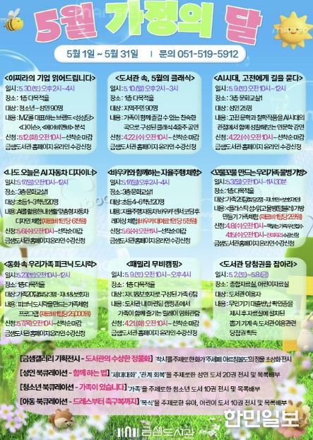 한민일보 서울포커스 임광현 기자 | 부산 금정구 금샘도서관은 5월 가정의 달을 맞아 오는 5월 1일부터 31일까지 작가(유튜버) 강연, 클래식 공연, 체험행사 등 온 가족이 함께 즐길 수 있는 '가정의 달' 특별 프로그램을 운영한다고 밝혔다.