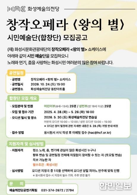 한민일보 서울포커스 진광성 기자 | (재)화성시문화관광재단은 오는 10월 개최 예정인 창작오페라 '왕의 별' 쇼케이스 무대에 참여할 시민합창단을 모집한다.