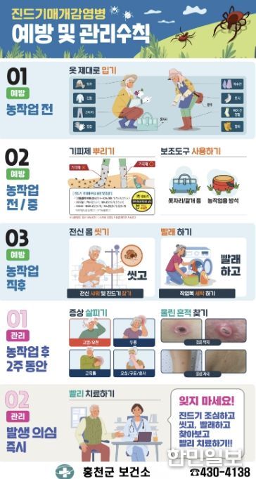한민일보 서울포커스 진광성 기자 | 홍천군보건소는 최근 기온 상승으로 진드기 활동이 활발해지고, 봄철 농작업과 야외 활동이 늘어남에 따라 진드기 매개 감염병 예방 수칙을 철저히 지켜 달라고 당부했다.