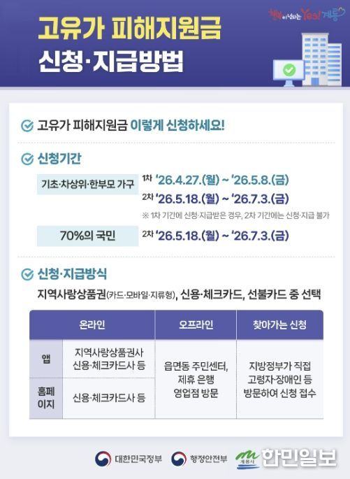 고유가 피해지원금은 1차로 4월 27일부터 5월 8일까지 취약계층을 대상으로 우선 지급하며, 2차는 기준 중위소득 70% 이하 가구를 대상으로 5월 18일부터 7월 3일까지 순차 지급한다.