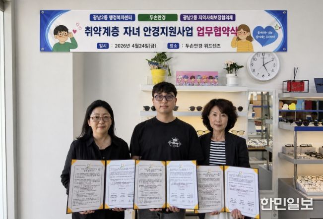 한민일보 서울포커스 임경복 기자 | 광주시 광남2동 행정복지센터와 지역사회보장협의체는 지역 안경업체 두 손 안경 위드렌즈와 함께 취약계층 아동·청소년의 시력 보호와 학습환경 개선을 위한 안경 지원사업 업무협약을 체결했다고 28일 밝혔다.