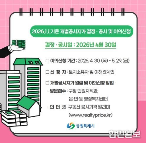 한민일보 서울포커스 김서윤 기자 | 창원특례시는 2026년 1월 1일 기준 개별공시지가 36만 5933필지를 4월 30일 결정·공시하고, 오는 5월 29일까지 이의신청을 접수한다고 밝혔다.