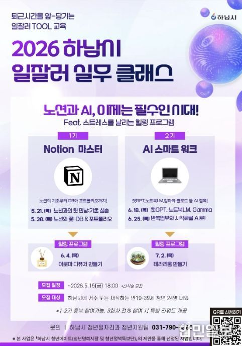 한민일보 서울포커스 유현민 기자 | 하남시는 관내 청년들이 현장에서 바로 활용할 수 있는 실무 역량을 키우고 또래 청년 간 교류 기회를 확대하기 위해 오는 5월부터 ‘2026년 하남시 일잘러 실무클래스’를 운영하고 1기와 2기 참여자를 모집한다고 밝혔다.