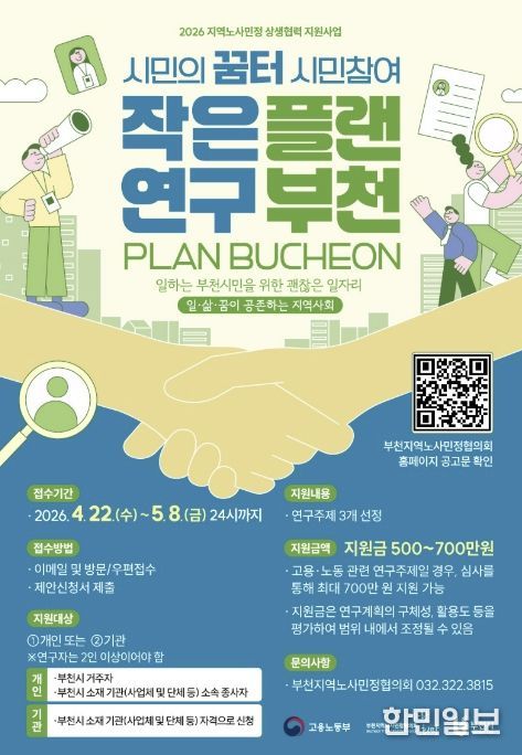 지원 대상은 부천시민 또는 부천시 소재 기관이며, 연구는 2인 이상이 참여해야 한다. 접수는 5월 8일까지 진행하며, 제안신청서를 작성해 전자우편, 방문 또는 우편으로 제출하면 된다.