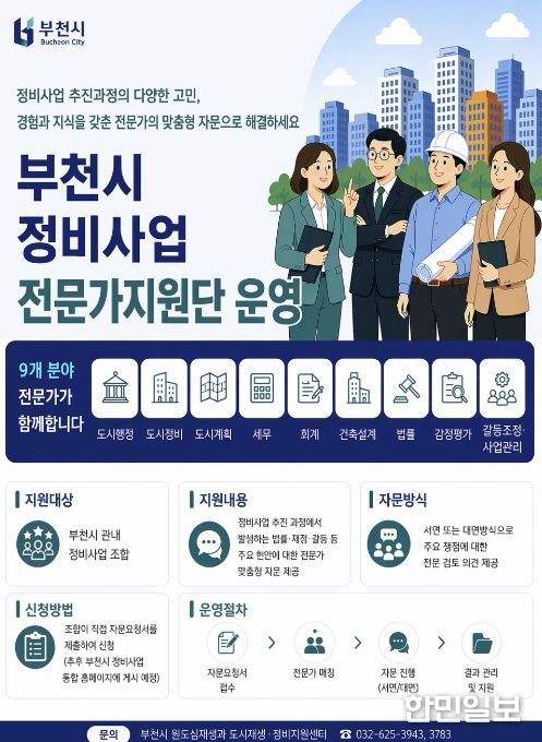 한민일보 서울포커스 김윤이 기자 | 부천시는 정비사업 추진 과정에서 발생하는 법률·재정·갈등 등 주요 현안에 대한 전문 자문을 지원하기 위해 ‘정비사업 전문가지원단’을 구성해 운영한다고 지난 28일 밝혔다.