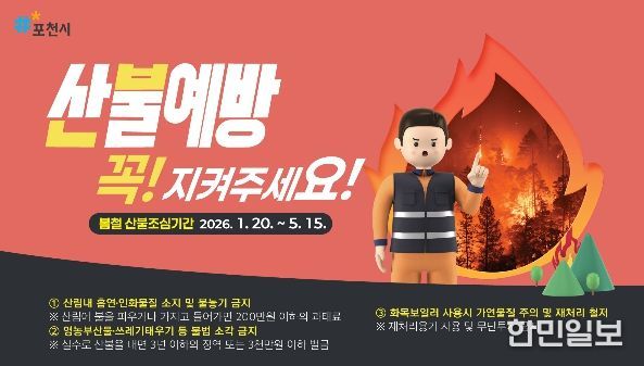 포천시는 시민들에게 영농부산물·쓰레기 불법 소각 금지, 산행 시 라이터·버너 등 화기 소지 및 흡연 금지, 입산통제구역과 등산로 폐쇄 구간 출입 금지 등 산불예방 수칙 준수를 당부했다.