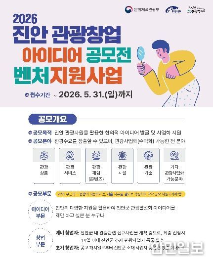 한민일보 서울포커스 박용남 기자 | (사)진안군관광협의회(이사장 이재동)가 지역 관광자원을 활용한 창의적인 아이디어를 발굴하고 실질적인 사업화를 지원하기 위해 ‘2026 진안 관광창업 아이디어 공모전’을 개최한다.