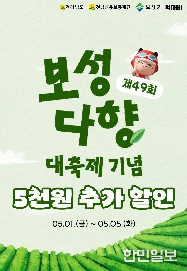 한민일보 서울포커스 박용남 기자 | 보성군은 제49회 보성다향대축제를 맞아 5월 1일부터 5일간 공공배달앱 ‘먹깨비’를 활용한 추가 할인 행사를 진행한다고 밝혔다.