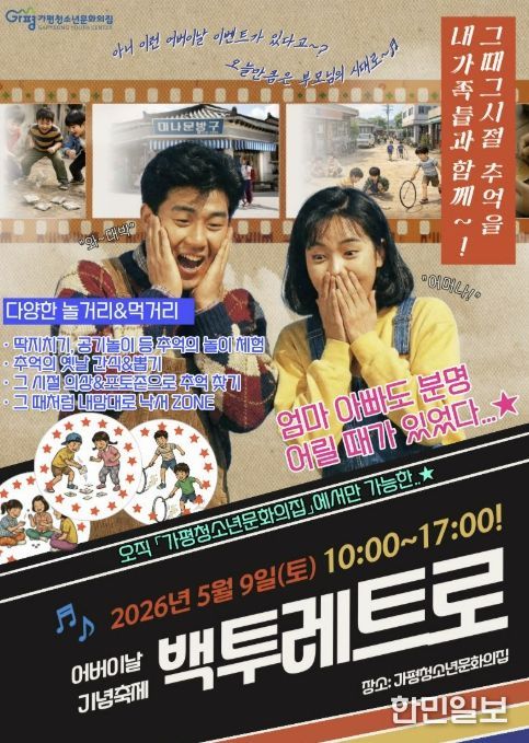 가평 군민을 대상으로 진행하는 이번 행사는 70~90년대 감성을 담은 체험과 놀이를 통해 청소년과 보호자 세대가 추억을 공유하도록 기획됐다.