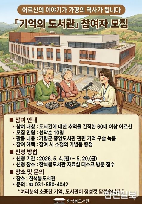 한민일보 서울포커스 최성훈 기자 | 가평군 한석봉도서관이 오는 5월부터 어르신들의 생생한 목소리로 지역의 옛 기록을 수집하는 ‘기억의 도서관’ 프로그램을 운영한다. 실버층 특화 사업인 ‘말랑말랑 추억 교실’의 일환으로 추진되는 이번 사업은 지역 문화 자산을 확보하고 세대 간 기억을 공유하고자 기획됐다.