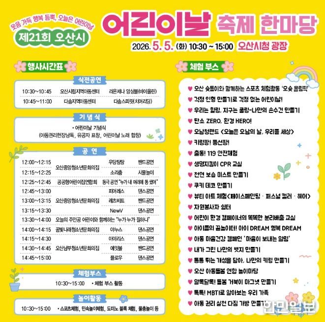 한민일보 서울포커스 임경복 기자 | 오산시는 오는 5월 5일 어린이날을 맞아 오산시청 광장에서 ‘제21회 오산시 어린이날 축제 한마당’을 개최한다고 밝혔다.