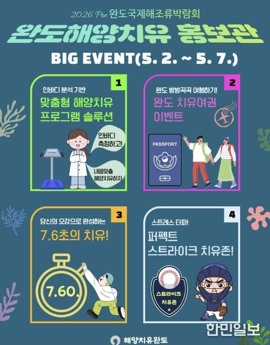 한민일보 서울포커스 박용남 기자 | ‘2026 Pre 완도국제해조류박람회’ 개최 기간(5.2~5.7) 동안 완도만의 해양치유 콘텐츠를 선보이는 ‘해양치유 홍보관’을 운영한다.