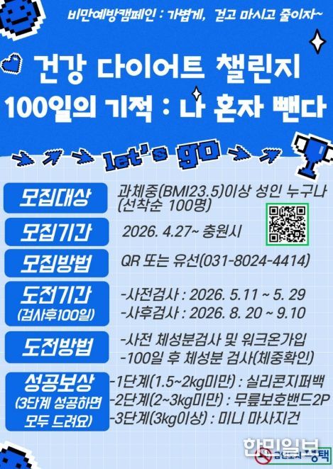한민일보 서울포커스 황준형 기자 | 평택시는 시민들이 스스로 비만 관리 능력을 키우고 건강한 생활 습관을 정착시킬 수 있도록 돕는 비만 예방 프로그램 '100일의 기적’참가자를 모집한다고 밝혔다.