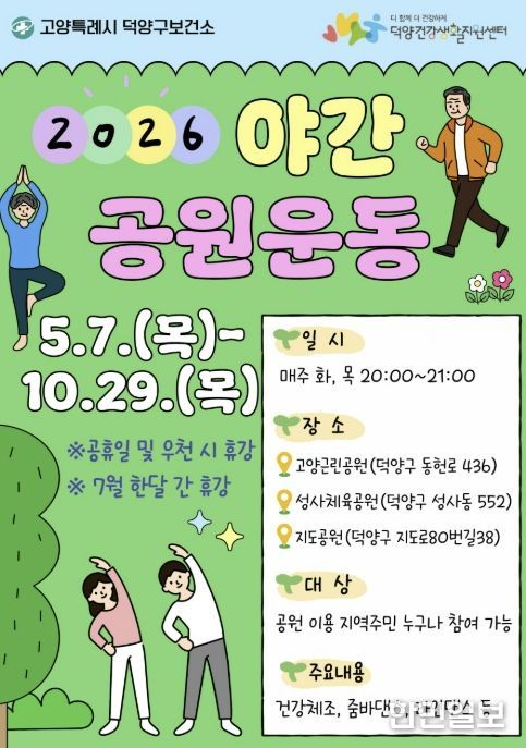 한민일보 서울포커스 김은금 기자 | 고양특례시 덕양구보건소는 오는 5월 7일부터 야간공원 운동교실을 운영한다.