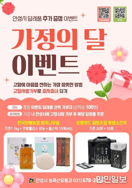 한민일보 서울포커스 임경복 기자 | 안성시는 오이데이와 5월 가정의 달을 맞아 고향사랑기부제 참여 확대와 지역 농산물 소비 촉진을 위해 ‘오이데이 이벤트’와 ‘가정의 달 이벤트’를 추진한다고 밝혔다.