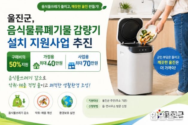 한민일보 서울포커스 김서윤 기자 | 울진군은 음식물쓰레기의 발생량 감소와 군민 생활환경 개선을 위해 ‘음식물류폐기물 감량기 설치 지원사업(3차)’을 오는 5월 22일까지 선착순으로 모집한다.
