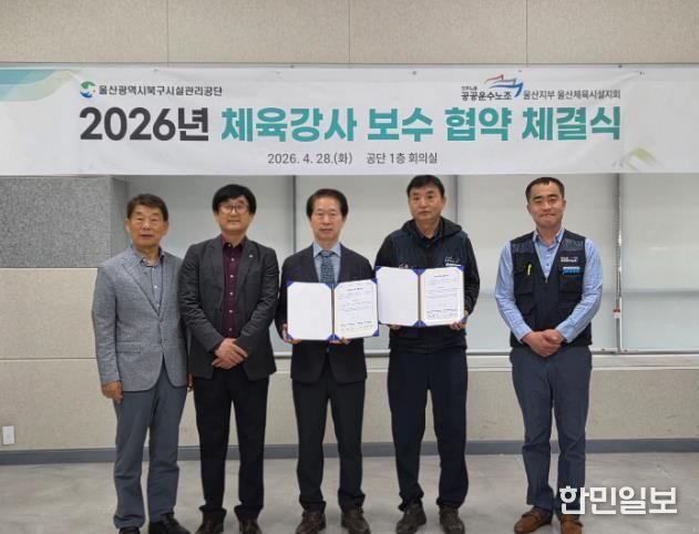 한민일보 서울포커스 기자 | 울산광역시북구시설관리공단과 전국공공운수사회서비스노동조합 울산지부 울산체육시설지회는 28일 공단 1층 회의실에서 체육강사들의 처우 개선과 상생 협력을 위한 ‘2026년 체육강사 보수 협약 체결식’을 개최했다,