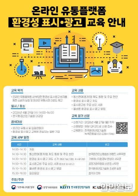 한민일보 서울포커스 진광성 기자 | 공정거래위원회와 기후에너지환경부는 4월 29일 한국환경산업기술원 대강당(서울 은평구 소재)에서 온라인 유통사를 대상으로 ‘환경성 표시·광고 교육’을 개최한다고 밝혔다.