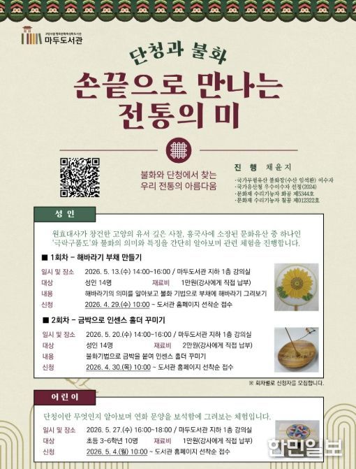 한민일보 서울포커스 김은금 기자 | 고양특례시 마두도서관은 오는 5월, 단청과 불화를 주제로 우리 전통의 아름다움을 체험할 수 있는 프로그램 ‘손끝으로 만나는 전통의 미’를 운영한다.