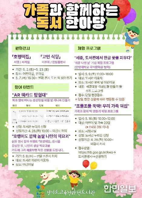 한민일보 서울포커스 김윤이 기자 | 경기도교육청과천도서관이 5월 가정의 달을 맞아 ‘가족과 함께하는 독서 한마당’을 운영한다.